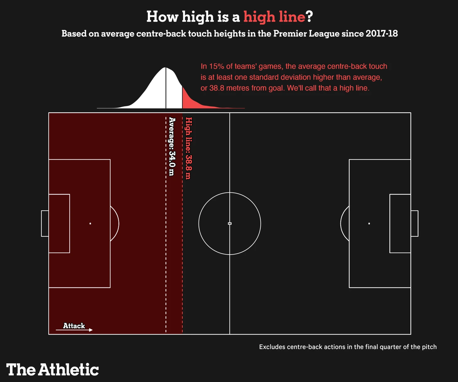 В среднем за этот период центральный защитник касался мяча в 34 метрах от своих ворот. В 15% игр команд среднее касание центрального защитника было по крайней мере на одно стандартное отклонение выше этого среднего показателя, или по крайней мере на расстоянии 38,8 м от ворот. Это, в свою очередь, дает нам определение высокой линии для целей наших данных и графиков.