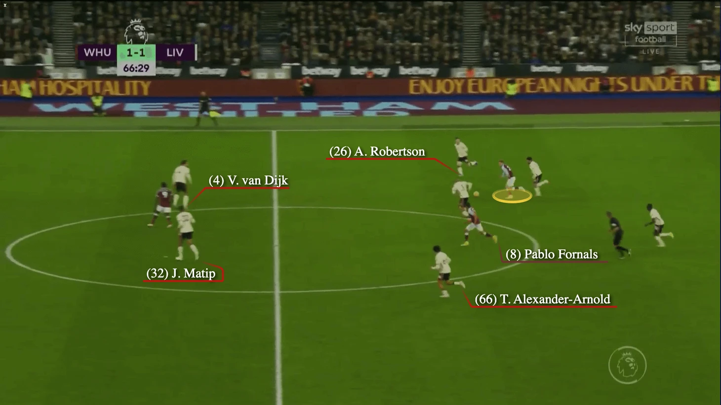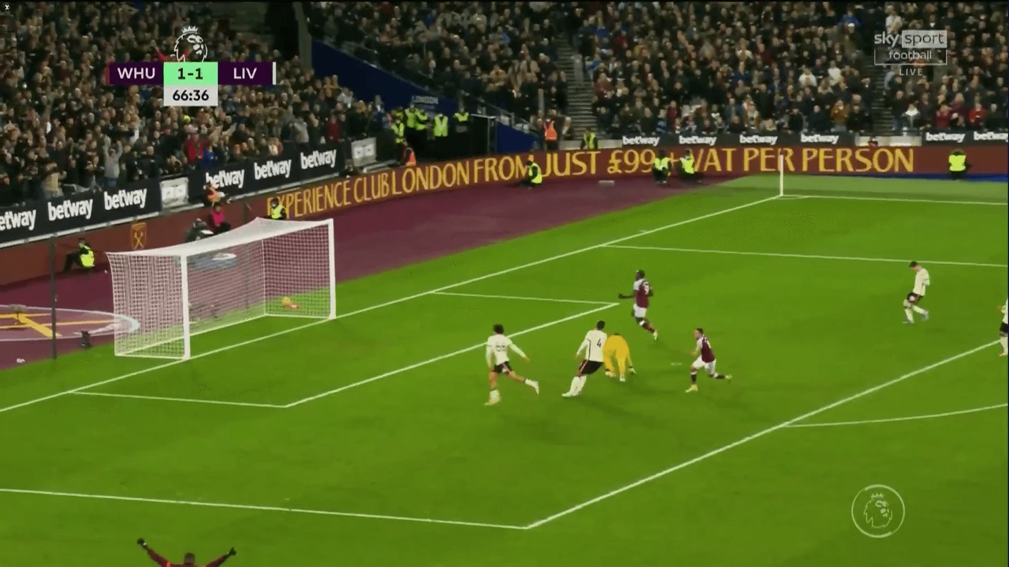 Ключевое отличие здесь, однако, заключается в том, что Джеррод Боуэн, в отличие от Пулишича на «Уэмбли» три месяца спустя, предпочитает продолжать владеть мячом, а не отдавать пас, который ожидают Ван Дейк и Жоэль Матип, и который привел бы к тому, что Микаил Антонио оказался бы в офсайде.