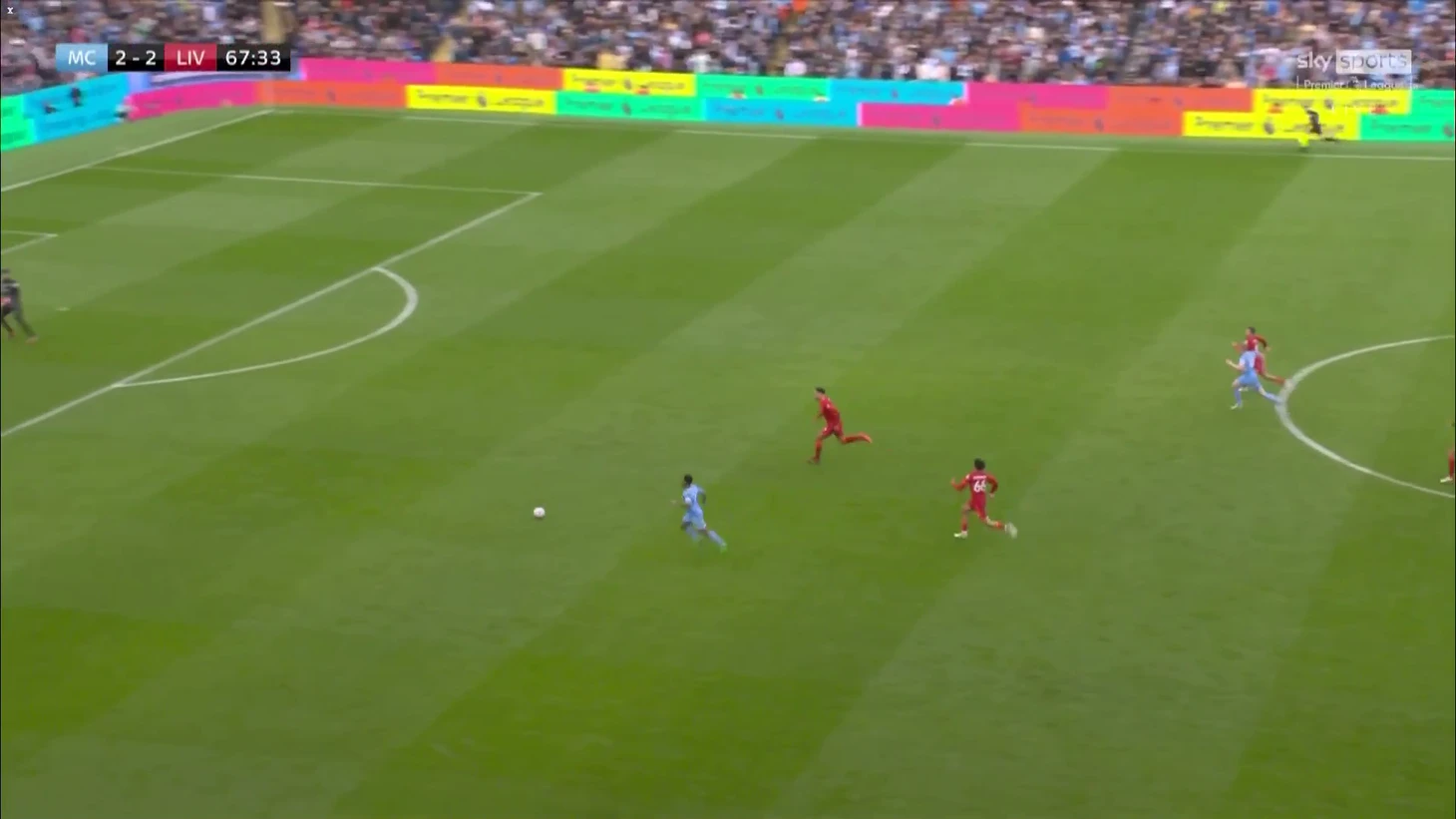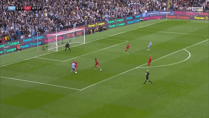 Следующее изображение — с выездной ничьей 2:2 против «Манчестер Сити» 10 апреля. Примечательно, что четверка защитников «Ливерпуля» сохраняет высокую линию, даже когда игрок, владеющий мячом — в данном случае Кевин Де Брюйне — находится близко к ним и не испытывает какого-либо значительного давления.