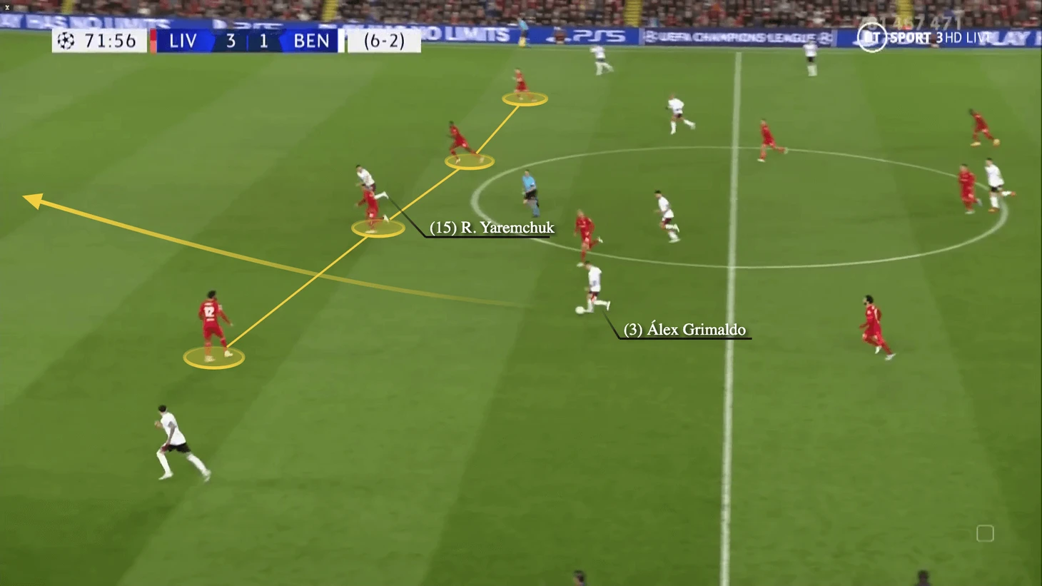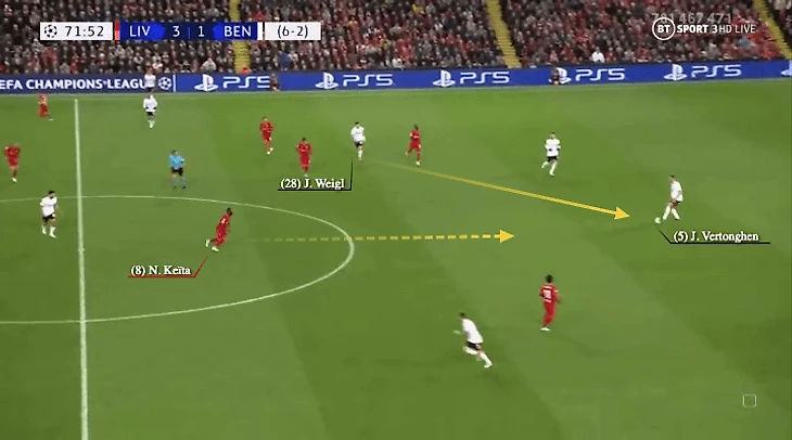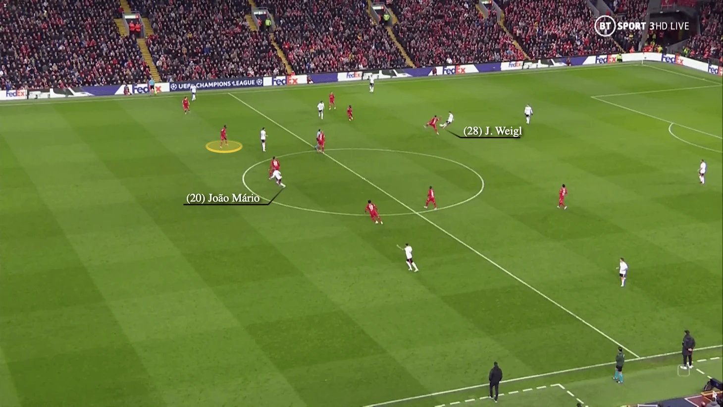 Поскольку и Мане и Роберто Фирмино занимают одну и ту же область поля, Наби Кейта решает сыграть роль нападающего и выйти вперед, чтобы потеснить центрального защитника «Бенфики». Кейта не успевает вовремя, оставляет за собой пространство, и Вертонген направляет пас в ноги Алексу Гримальдо, который получает мяч вполоборота.
