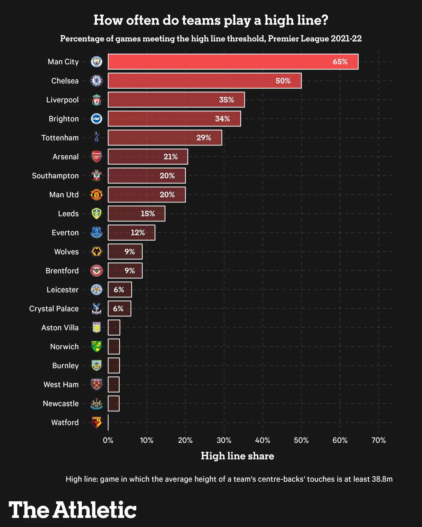 Глядя на Премьер-лигу в этом сезоне, неудивительно, что «Сити» играет с высокой линией больше, чем кто-либо другой — опять же, стоит помнить, что определение высокой линии фокусируется на средней позиции касаний центрального защитника. «Челси», как ни странно, опережает «Ливерпуль». «Брайтон», чей стиль игры во многих отношениях ближе к остальной шестерке лучших, чем у «Манчестер Юнайтед», занимает четвертое место.