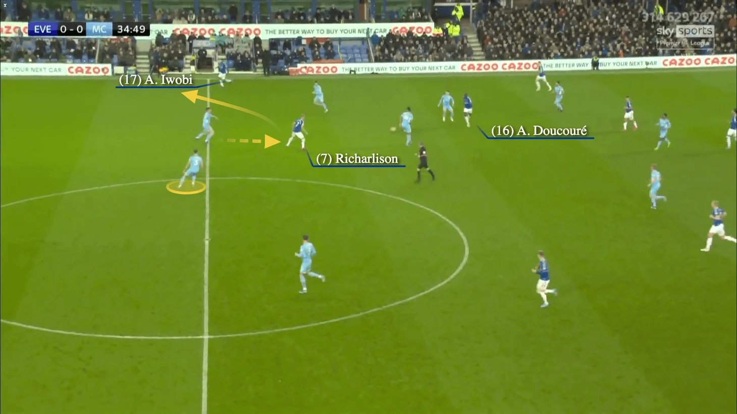 Следующие снимки сделаны из выездной победы над «Эвертоном» со счетом 1:0 в конце февраля. В тот момент, когда Абдулай Дукуре отдает пас Ришарлисону, Эмерик Лапорт делает шаг вперед, и Рубен Диаш (обведен кружком на обоих снимках) выходит вперед, ловя Алекса Ивоби в офсайд.