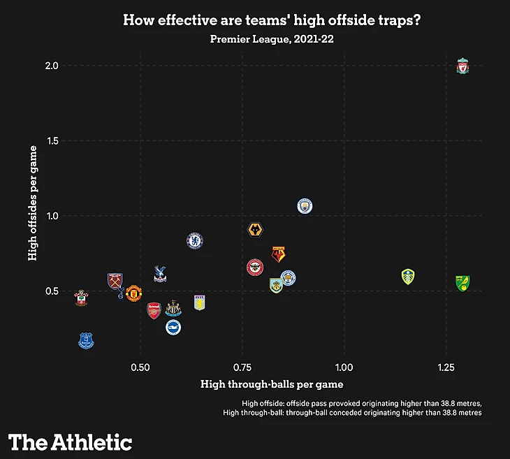 Возможно, стоит отметить, что, хотя мы знаем, что «Ливерпуль» играет в офсайдную ловушку высоко в поле, это приводит всего к трем офсайд или пасам вразрез за игру, что намного меньше, чем кажется.