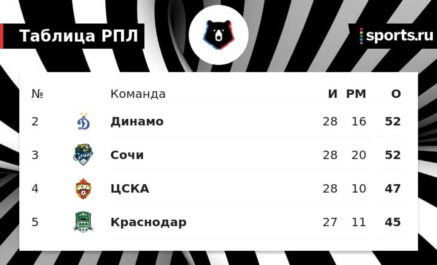 ЦСКА после 28-го тура РПЛ выпал из борьбы за второе место: теперь на него претендуют «Динамо» и «Сочи» – между ними с призрачным шансами втиснулся «Краснодар».
