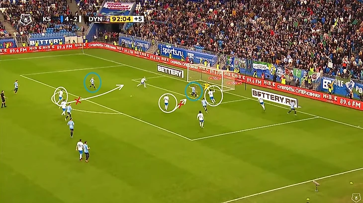 Совсем не факт, что Бальбуэна отобрал бы мяч у своего оппонента, если бы он не стал пятиться назад, а попытался накрыть его. В финальной части этой атаки прекрасно виден провал всей нашей обороны: два центральных защитника против четырёх соперников — без шансов.