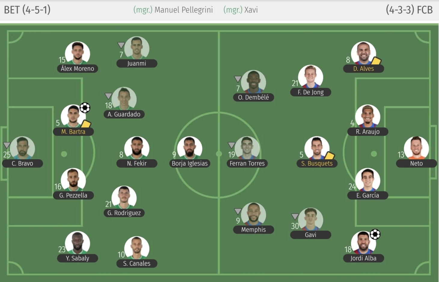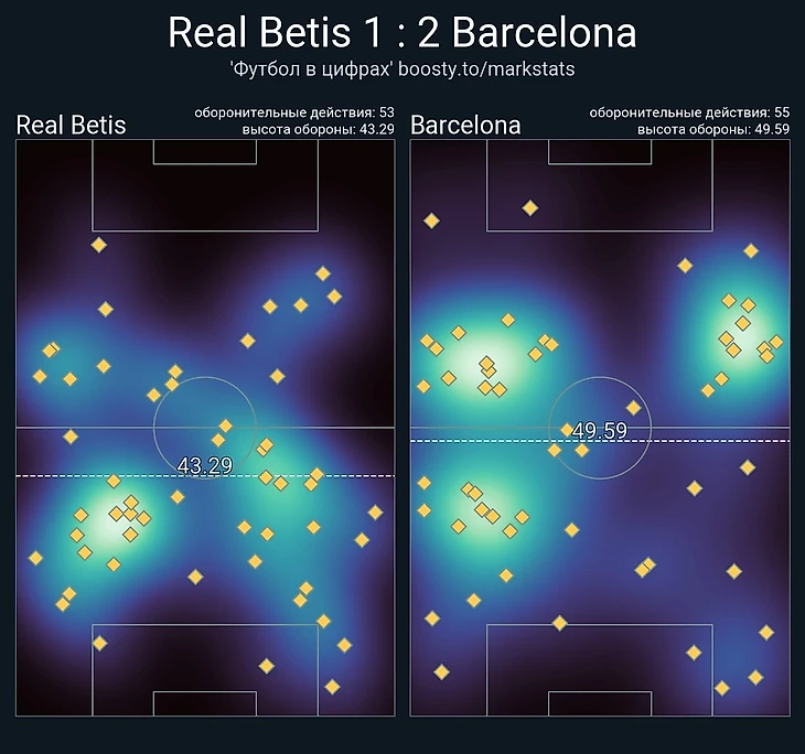 Хочу ещё предостеречь тех, кто смотрит лишь на цифры владения, от далекоидущих выводов о равенстве в игре (владение 42,6% на 57,4%), поскольку важно не только то, сколько владела команда мячом, но и где проходила игра, а по этому показателю «Барселона» превзошла хозяев поля в 2 раза (32,7 у «Бетиса» и 67,3 у «Барсы»). Сочетание Гарсии, Альбы, Гави и Мемфиса слева спровоцировали доминирующее количество атак именно через их фланг. Слева «Барса» атаковала в 46% случаев.