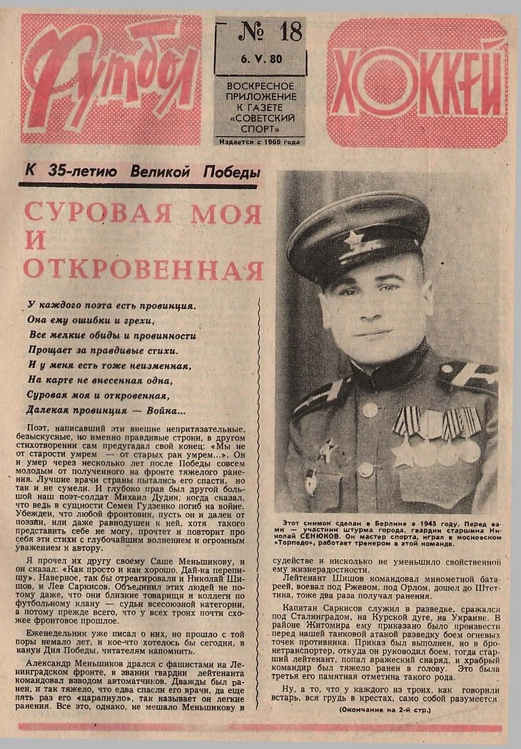 В 1980-м о войне говорил футболист московского «Торпедо» Николай Сенюков. И это первое упоминание о ВОВ за 10 лет: все внимание уделялось чемпионату мира по хоккею, который в начале мая традиционно вступал в решающую стадию.