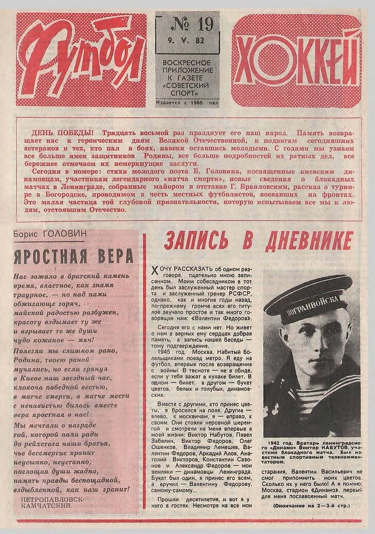 1982-й. На заглавной странице – тяжелые воспоминания вратаря ленинградского «Динамо», участника знаменитого «блокадного матча» и комментатора Виктора Набутова.