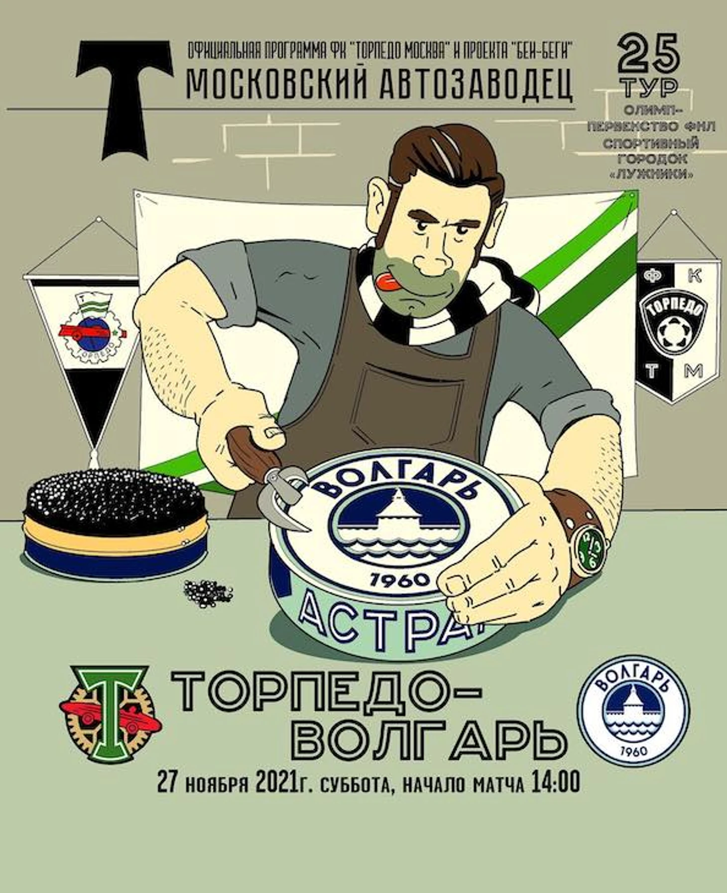 Гастрономические референсы тоже на месте. На афише к матчу с астраханским «Волгарем» мужчина в черно-белом шарфе пытается вскрыть банку с черной икрой – местным деликатесом.