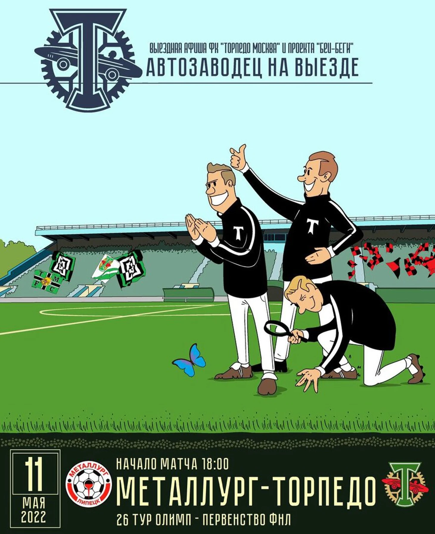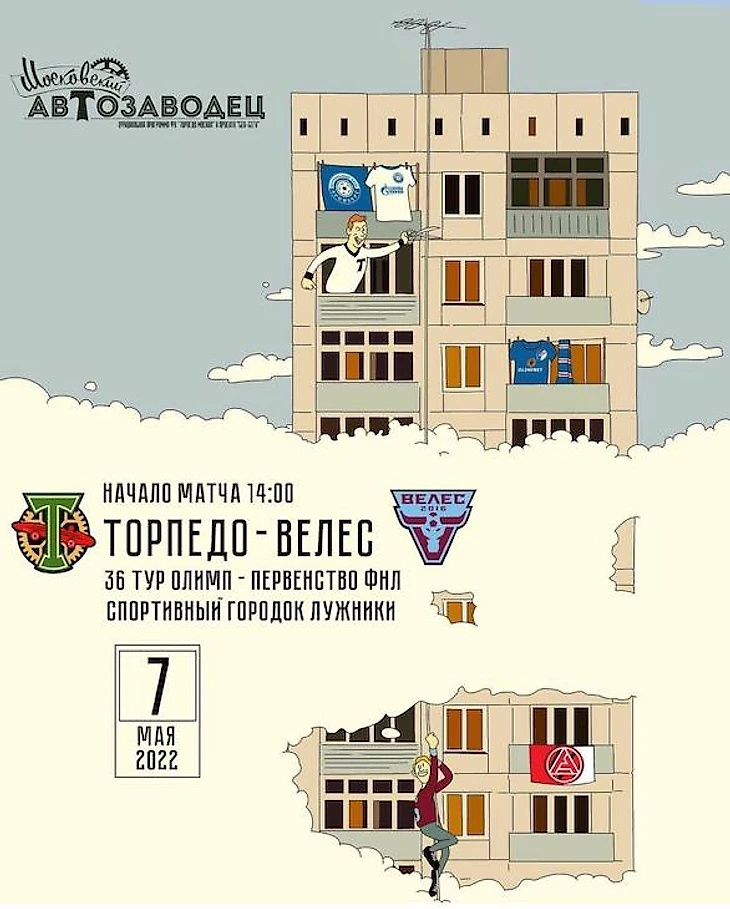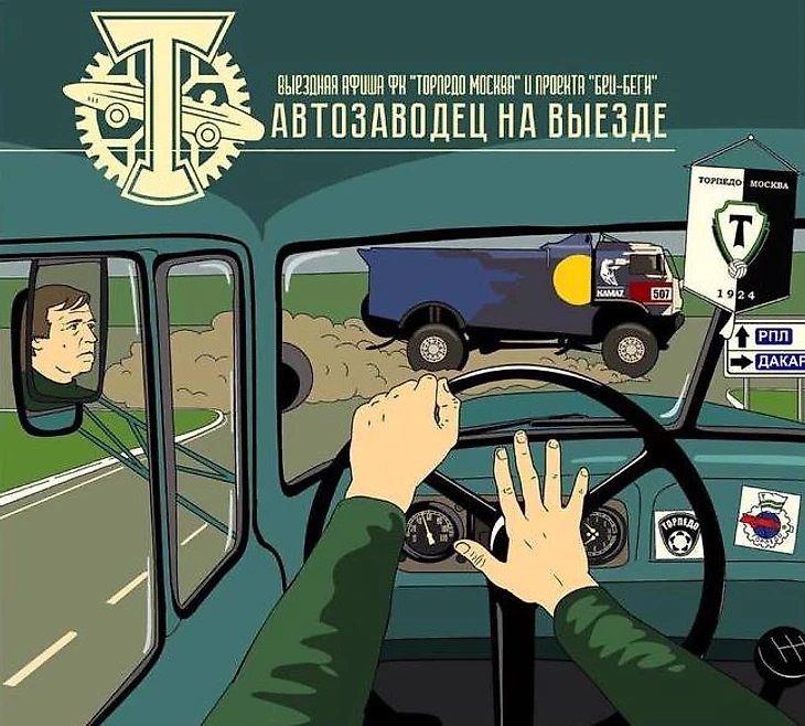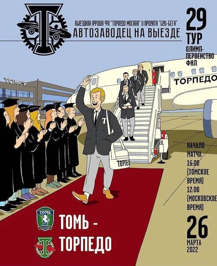 Афиша на игру с «Томью» – отсылка к статусу Томска, который считают студенческой столицей России. Футболистов «Торпедо» с самолета встречают выпускники университетов. Вполне мирная картинка.