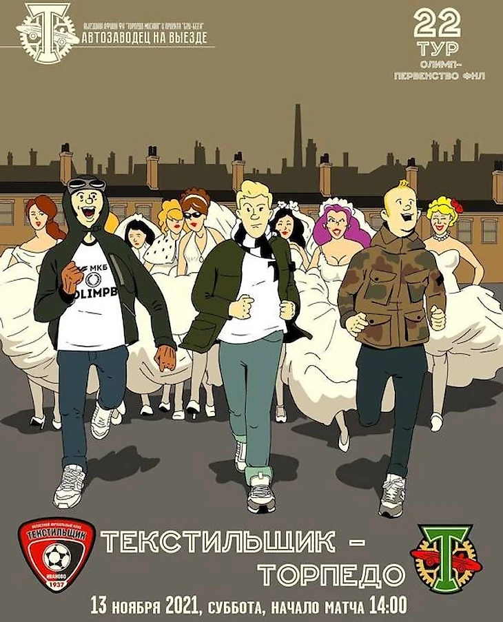 К статусу города отсылает и афиша к игре с ивановским «Текстильщиком». Иваново – город невест, поэтому девушки в свадебных платьях бегут за довольными болельщиками «Торпедо».