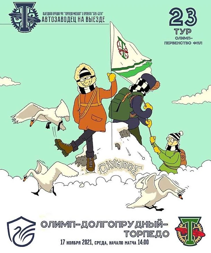 К игре с «Олимпом-Долгопрудный» нарисовали людей, которые забираются на Олимп, чтобы водрузить на него флаг с логотипом «Торпедо».