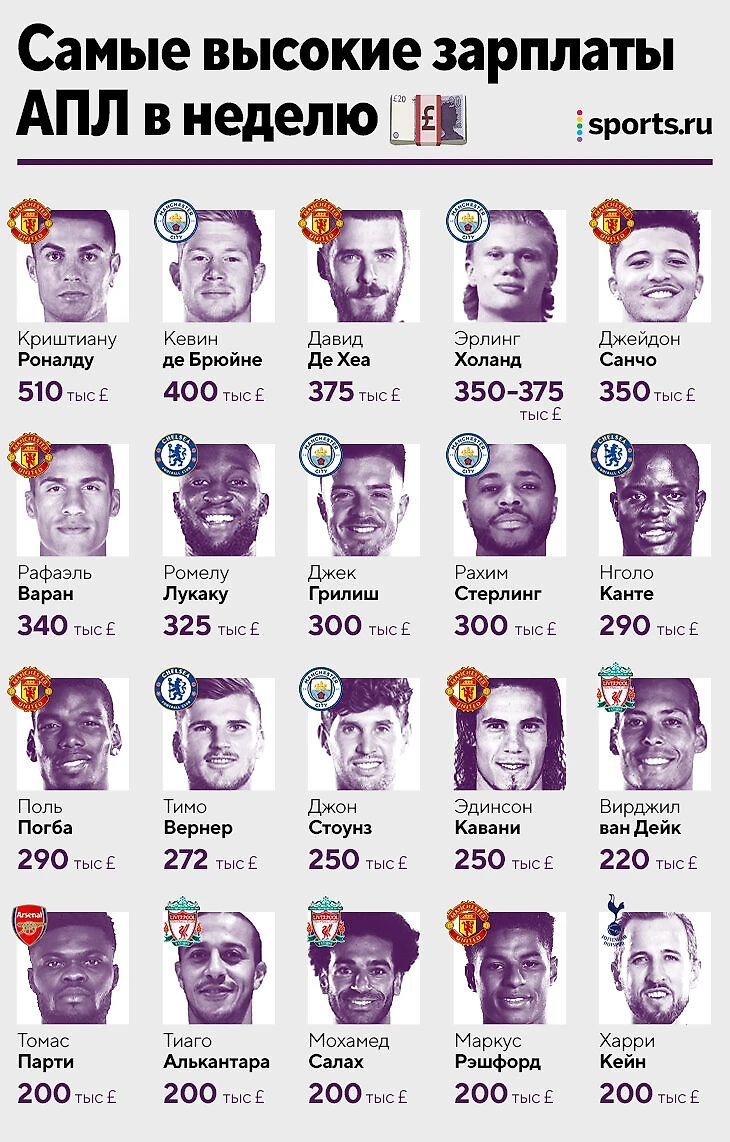 В футболе сложно назвать сумму, которую игрок получает на руки, потому что выплаты зависят от бонусов за голы, титулы, игровое время – поэтому в разных источниках часто указываются разные зарплаты. Daily Mail, например, считает, что Де Брюйне получает 385 тысяч в неделю. Столько же зарабатывает Криштиану Роналду, а у Давида де Хеа – 375 тысяч.