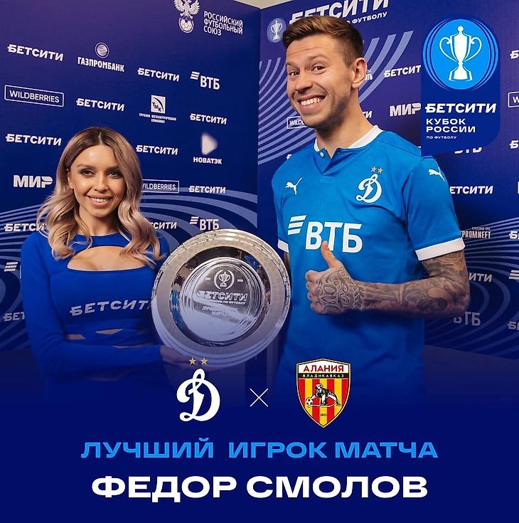 Московское «Динамо» обыграло «Аланию» со счетом 3:0 в полуфинале БЕТСИТИ Кубка России и стало первым финалистом турнира. Форвард бело-голубых Федор Смолов признан лучшим игроком матча.