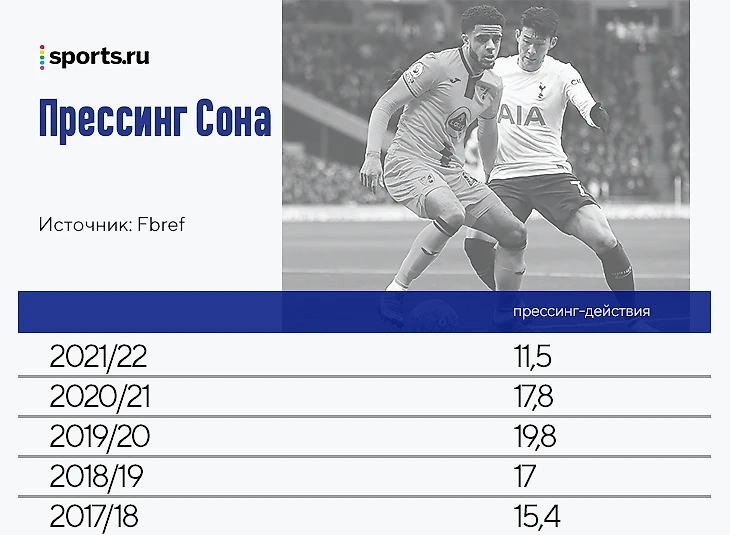 В сезоне-2021/22 количество прессинг-действий Сона резко уменьшилось, разница с прошлыми сезонами огромна.