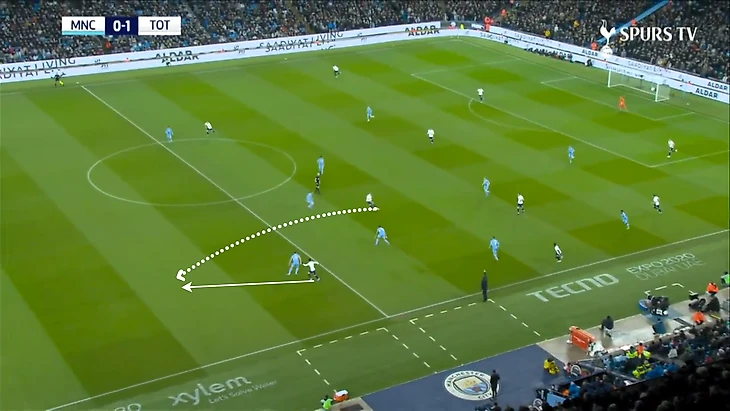 Когда в прессинг выдвинулся Кайл Уокер – единственный защитник «Сити», который мог бы конкурировать с Соном за счет скорости и физических данных, – мяч быстро доставили вперед, и Сон убежал от Диаша.