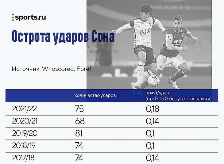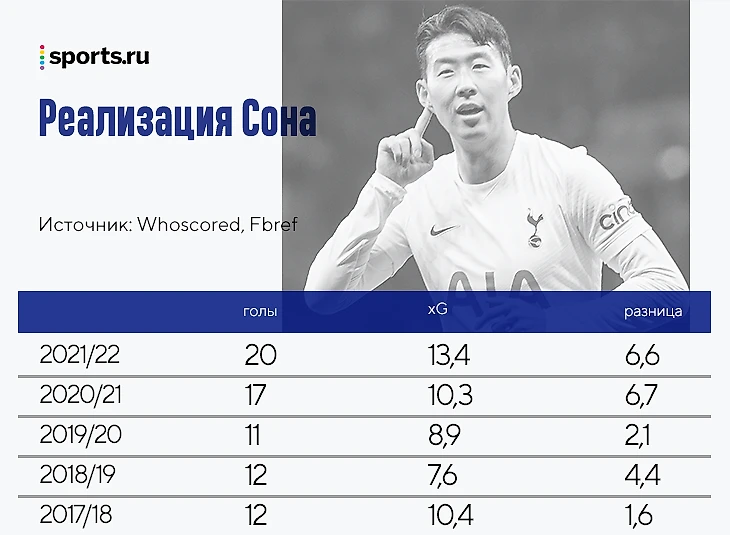 Еще один важный фактор результативности Сона – его реализация. По данным StatsBomb, в последних пяти сезонах Сон забивает уверенно больше xG. Understat дает данные с сезона-2014/15, там тоже голы Сона выше ожидаемых. Исключение – первый сезон корейца в Англии (2015/16), где он забил в соответствии с xG, но это единственный сезон, в котором Сон играл очень мало из-за адаптации и травм.
