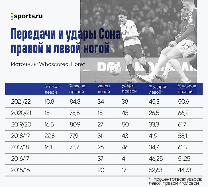 В этом сезоне Сон нанес 34 удара левой ногой и 38 правой. В процентном соотношении больше было в первые два сезона в «Тоттенхэме», в абсолютном – только в кампании- 2016/17 (37). Но, во-первых, в этом сезоне Сон уже сыграл больше, а во-вторых, сезон еще не закончен, и кореец наверняка побьет собственный рекорд и по общему количеству ударов (81 в сезоне-2019/20, сейчас 75), и по ударам с левой.