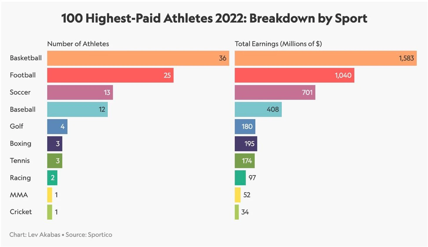 🔸В баскетболе больше богачей, чем в футболе – 36 против 13 в топ-100 рейтинга. В амфуте их тоже больше – 25, а в бейсболе всего на одного меньше.