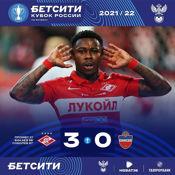 «Спартак» одержал разгромную победу над «Енисеем» (3:0) в полуфинальном матче БЕТСИТИ Кубка России, который проходил в Москве на стадионе красно-белых.
