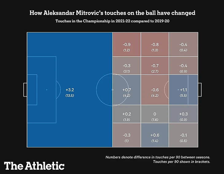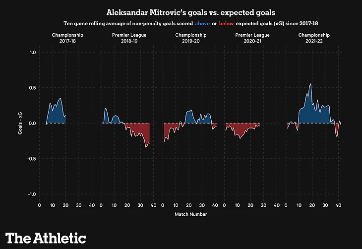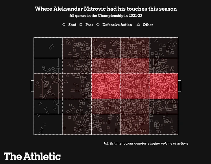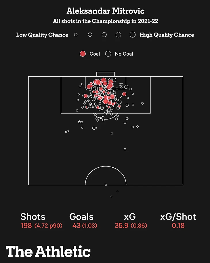 Митрович входит в состав атакующей команды, которая в сумме забила 106 голов и создала для себя моменты, равные 0,86 xG за 90 минут: больше, чем у любого игрока в дивизионе. Тем не менее, он по-прежнему превосходит свой показатель ожидаемых голов, в среднем 1,01 гола за 90 минут. Только Мэтт Годден из «Ковентри Сити» может претендовать на подобный уровень превосходства в Чемпионшипе — а в этом сезоне он забил всего 12 голов.