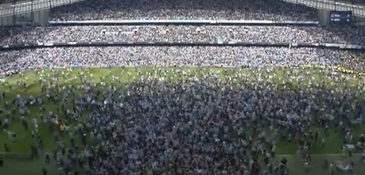 3:2 в пользу "Сити". Радости болельщиков «горожан» не было предела. Их команда вырвала чемпионство из рук «Манчестер Юнайтед» на самых последних секундах чемпионата. А сразу после финального свистка началось безумие. Болельщики тут же рванули на поле.