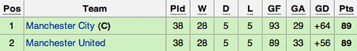 В итоге «Сити» и «Юнайтед» набрали одинаковое количество очков (по 89), но команда Манчини выиграла титул за счёт лучшей разницы мячей. Невероятный по накалу футбольных страстей сезон.