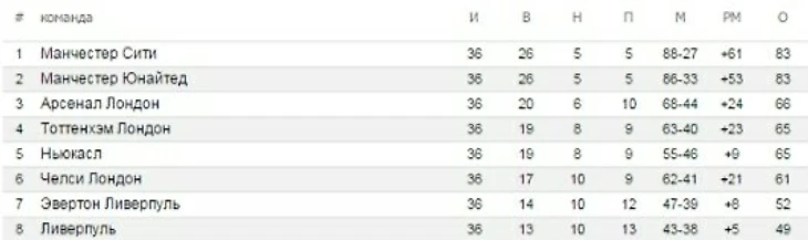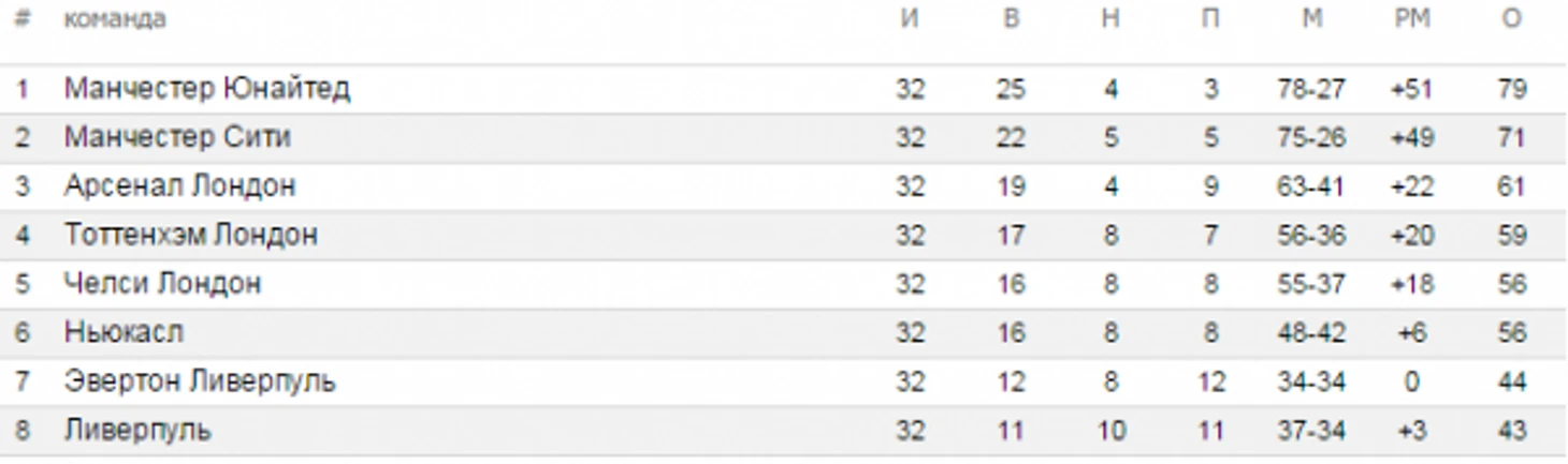 В итоге за 6 туров до конца чемпионата таблица выглядела так. Команда Манчини отстала от «Манчестер Юнайтед» аж на 8 очков.