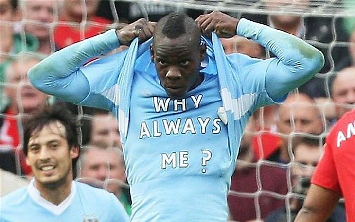 В дерби на «Олд Траффорд» Манчини выпустил в атаке Балотелли и Агуэро. Игра закончилась разгромной победой «Манчестер Сити» со счётом 1:6. Именно в этом матче Марио Балотелли продемонстрировал свой известный перформанс «Why always me?» («Почему всегда я?»). Сам Марио в марте 2012 раскрыл его смысл: «Надпись «Почему всегда я?» посвящалась всем, кто всего говорит про меня плохие вещи, хотя совсем меня не знает. И я просто спросил у этих людей: почему я».
