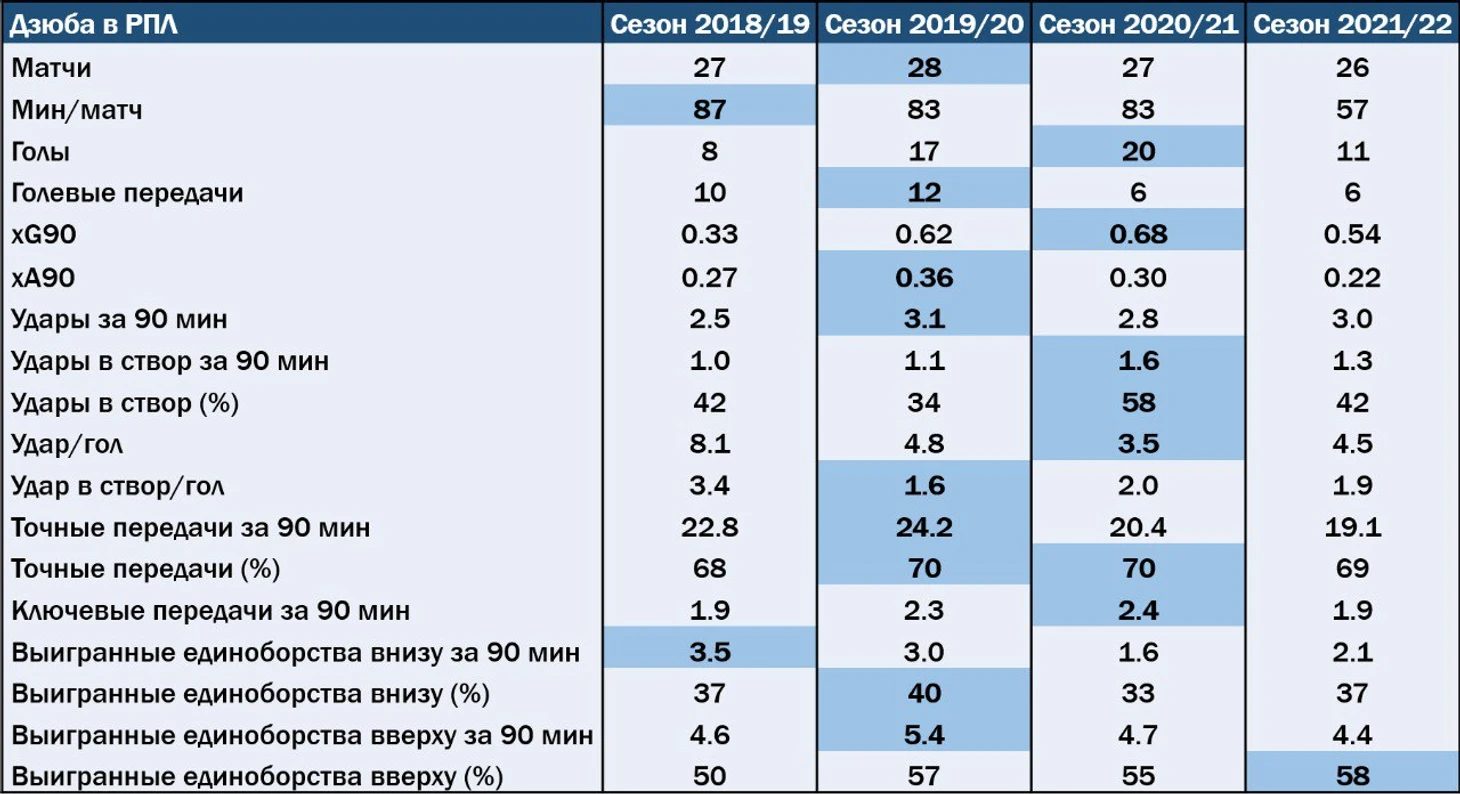 В сезоне 2021/22 Дзюба был на поле все 90 минут только в 7 матчах. По сравнению с прошлыми сезонами количество матчей в старте и игровое время резко просели, а число замен увеличилось. При этом стоит отметить, что игровые показатели Артёма в пересчёте на 90 минут остаются на уровне последних трёх сезонов.