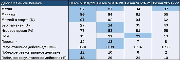 Дзюба стабильно для себя набрал за сезон 20+ очков по системе «гол+пас». Однако, он уже не является «решалой» на поле в важных матчах, как это было раньше. В сезоне 2021/22 у Артёма всего 2 результативных действия, которые стали победными (10% всех результативных действий). В прошлых сезонах, как минимум, каждый 5й гол/пас приносил победу СБГ.