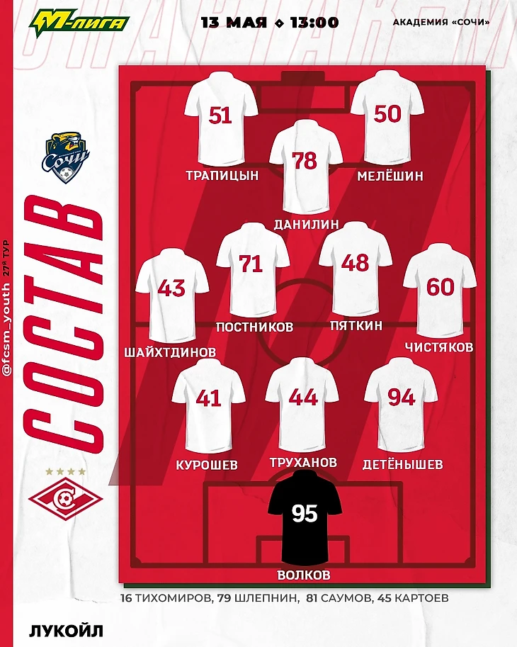 «Спартак» (мол.): Волков, Чистяков, Детёнышев (к), Труханов, Курошев (Саумов, 80), Шайхтдинов, Пяткин, Постников, Данилин (Картоев, 69), Трапицын, Мелёшин.
