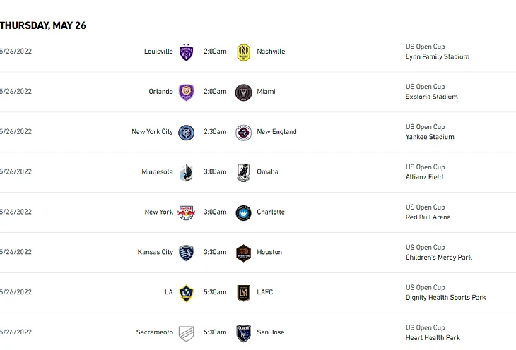 Стоит отметить, что только 3 команды не из MLS добрались до это стадии. Луисвилль примет Нэшвилл, Омаха едет в гости к Миннесоте, а Сакраменто примет Сан Хосе.