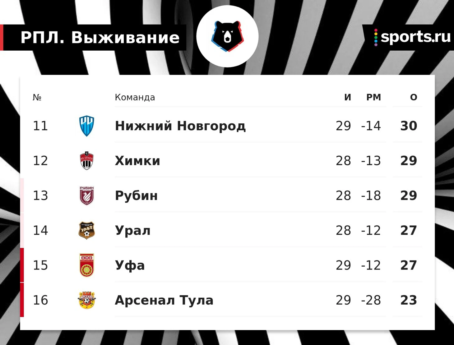 Из интриг в борьбе за невылет напрямую – кто будет 15-м. Уфимцы сейчас сравнялись с «Уралом». К тому же «Химки» и «Рубин» еще не в безопасности.