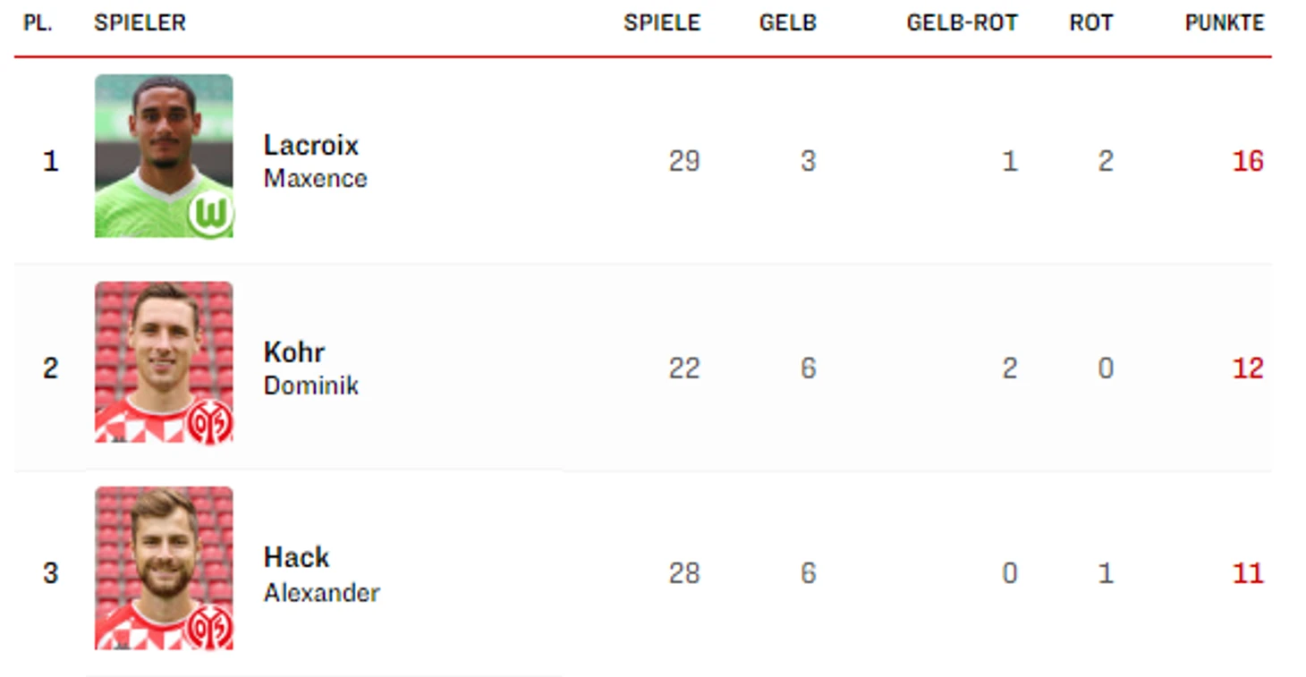 *игрок – кол-во игр – желтые – 1+1 желтые – красные – всего