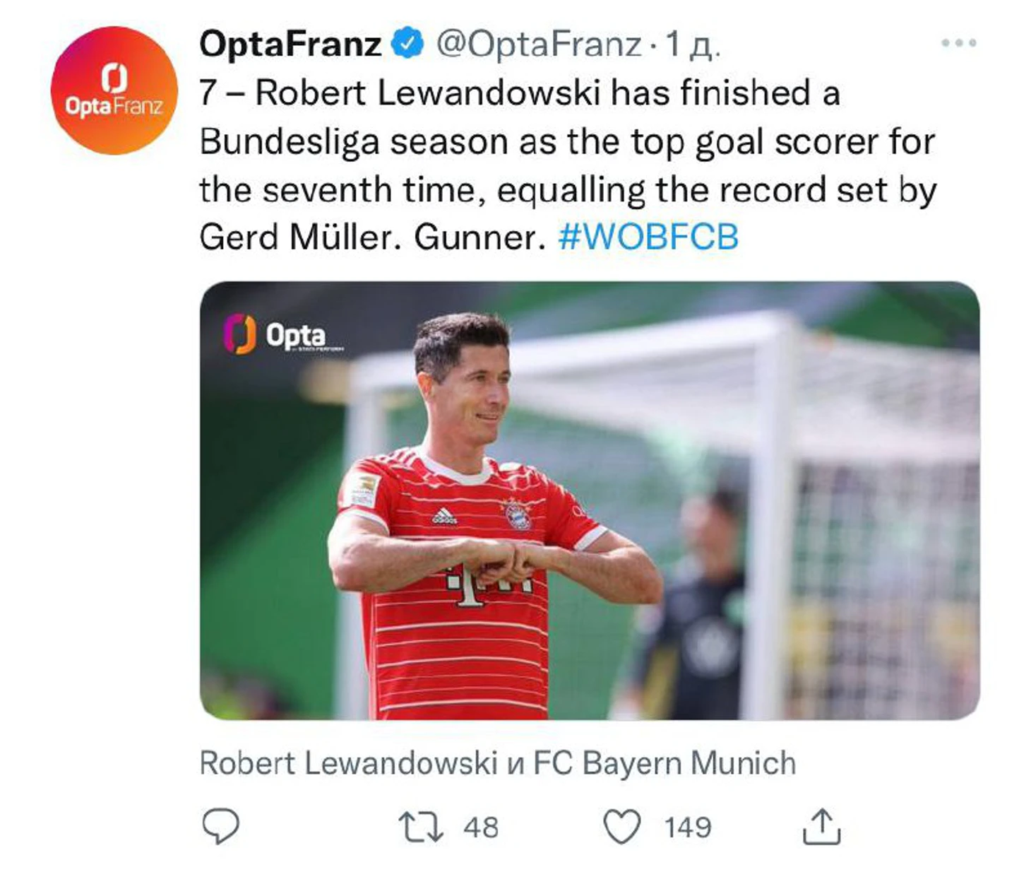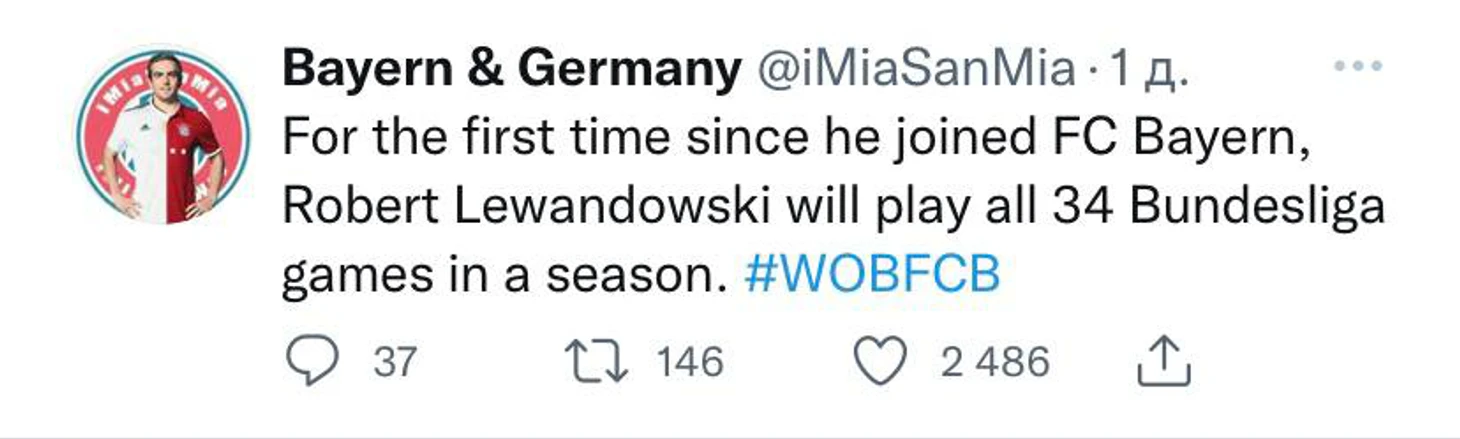 • Роберт Левандовски забил в этом сезоне 35 мячей – такой отметки в истории Бундеслиги достигли только два игрока: Герд Мюллер (трижды) и Роберт Левандовски (во второй раз).