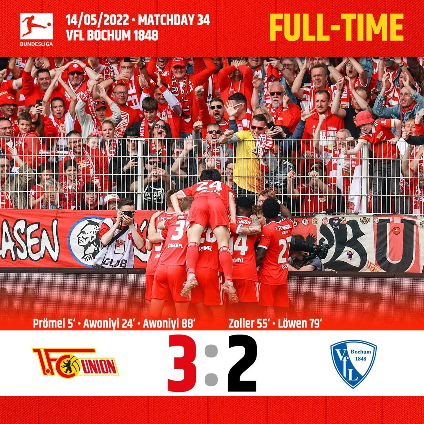 Казалось, матч можно заканчивать. «Бохум» совсем не впечатлял зрителей своей игрой, а «Унион», напротив, разрывал оборону соперника. Однако во втором тайме гости показали характер. На 55-й минуте после навеса Цоллер сумасшедшим ударом головой в дальний угол распечатал ворота столичной команды. У Авонийи был неплохой шанс сделать дубль в середине второго тайма, но Луте переиграл нигерийца. На 78-й минуте Эдуард Левен классно пробил в правый угол ворот и сравнял счет. За две минуты до конца основного времени Авонийи все же удалось забить второй мяч. Нигериец обыграл защитников «Бохума», усадил на газон вратаря соперника и вырвал для своей команды победу вместе с путевкой в Лигу Европы.