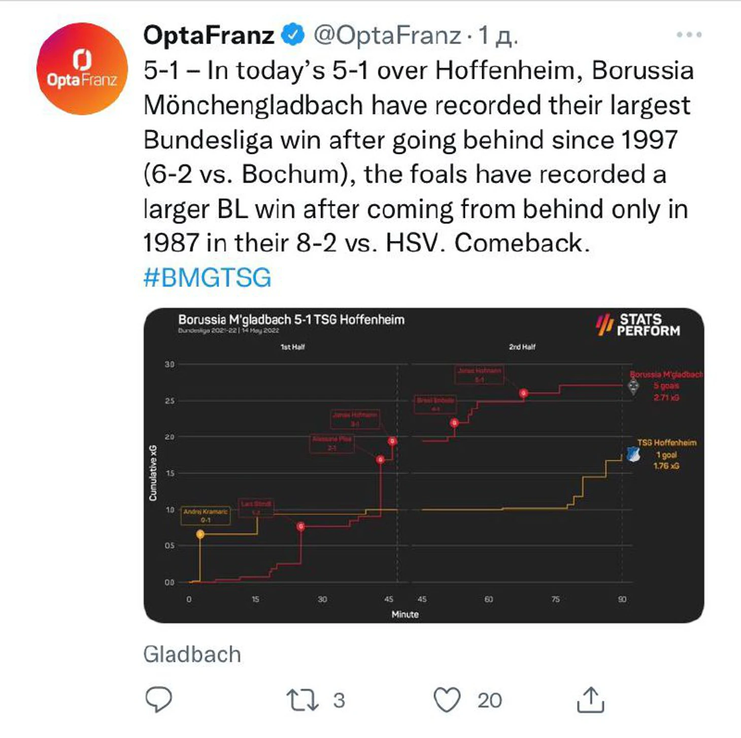 Йонас Хофманн в этом матче был на высоте! На 53-й минуте встречи немец отдал изумительный пас на отрывающегося от опекунов Эмболо. Швейцарец ворвался в штрафную и практически с одиннадцатиметровой отметки перекинул мяч через вратаря. На 68-й минуте Хофманн поставил жирную точку в субботнем противостоянии команд. Акпогума в своей штрафной не смог разобраться с мячом, фактически скинув его на Йонаса. Хофманн тут же в одно касание закатил мяч в ближний угол, который, кстати, контролировал Бауманн. В концовке встречи у Крамарича был шанс вновь отличиться, но футболист в очередной раз оказался неточен.