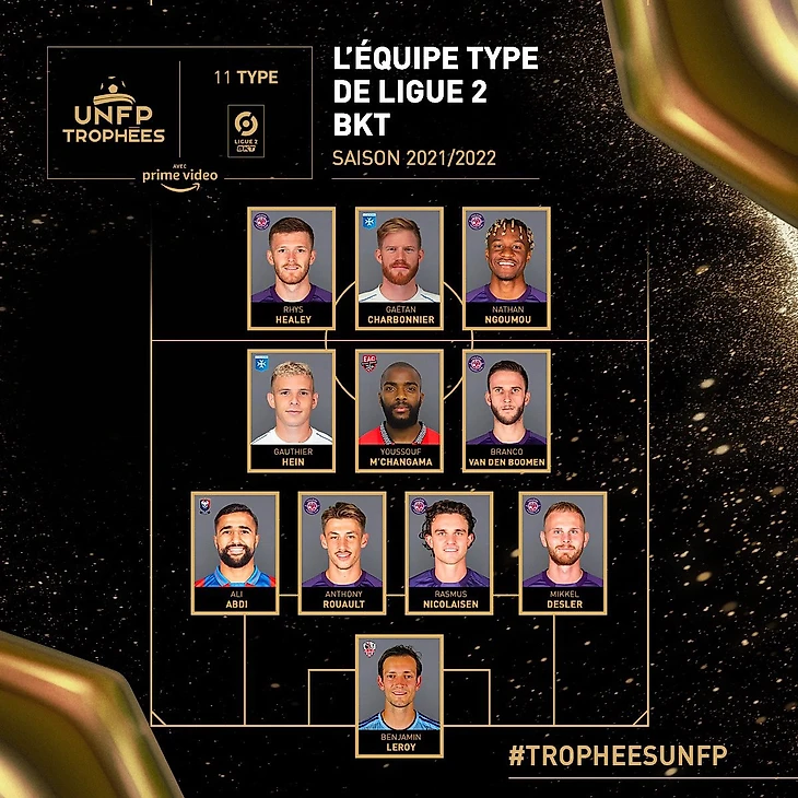 В символическую сборную сезона вошли игроки "Тулузы", "Аяччо", "Кана", "Осера" и "Генгама": Бенжамен Леруа ("Аяччо"), Али Абди ("Кан"), Антони Руо ("Тулуза"), Расмус Николайсен ("Тулуза"), Миккель Деслер ("Тулуза"), Готье Эйн ("Осер"), Юссуф М'Шангама ("Генгам"), Бранко Ван ден Боомен ("Тулуза"), Рис Хили ("Тулуза"), Гаэтан Шарбоннье ("Осер") и Натан Нгуму ("Тулуза").