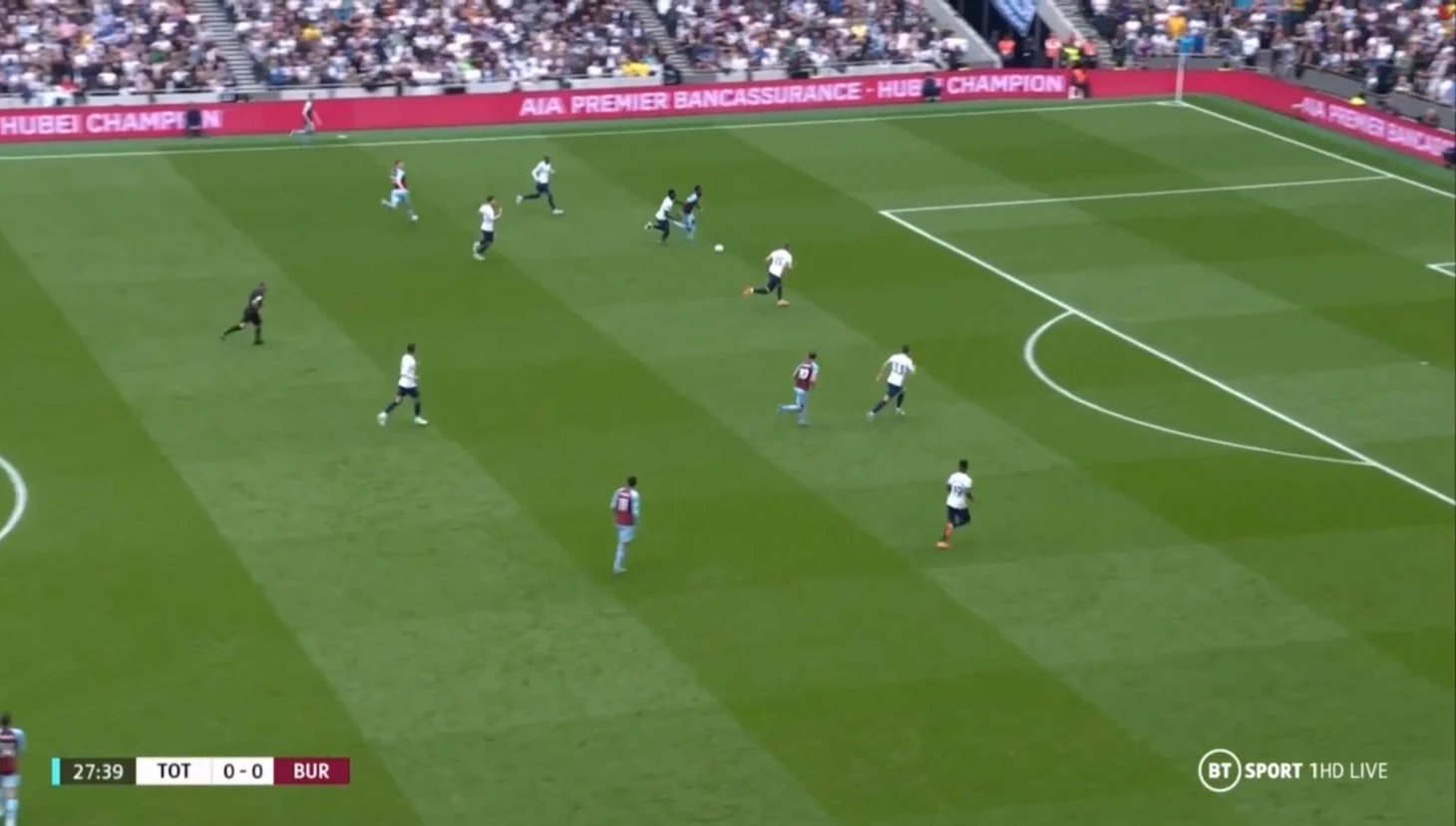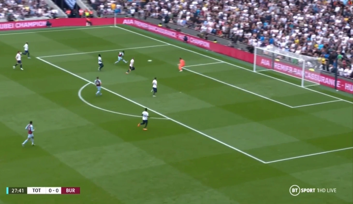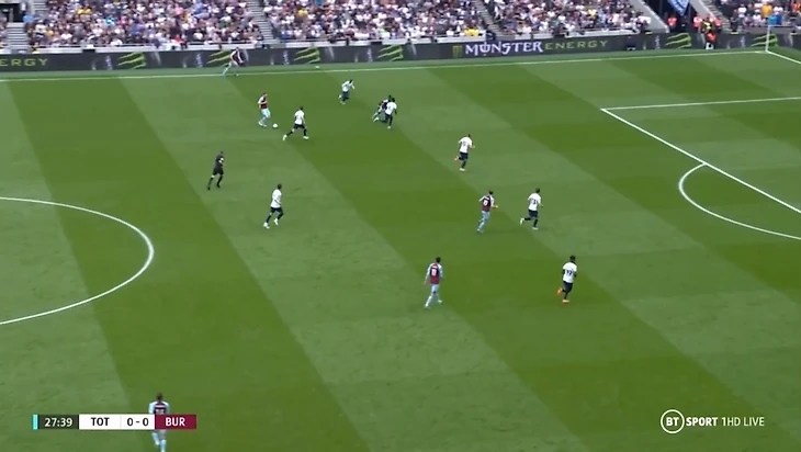 В основе из-за ротации отсутствовал Кулусевски и травмированный Ромеро. Вместо них играли Моура и Санчес. С самого начала встречи Тоттенхэм прижал Бёрнли к их воротам. В первые 10 минут «шпоры» сделали 109 передач против 9 пасов у «бордовых». Давление хозяев выражалось и в ударах. Их было много, но большинство выстрелов приходилось либо мимо створа, либо прямо в Поупа, поэтому разбирать здесь нечего. У Бёрнли за весь тайм была лишь одна возможность выйти вперёд. На 27 минуте Корне получил пас от Коллинза, вышел один на один с Льорисом, но не смог переиграть вратаря Тоттенхэма.