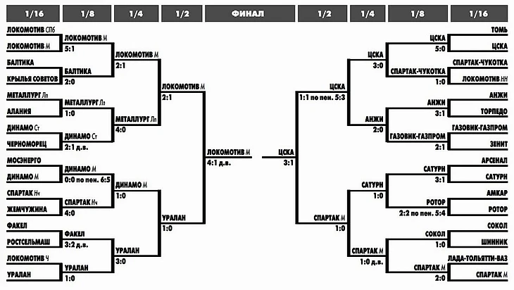 Железнодорожники по ходу турнира прошли одноклубников из Санкт-Петербурга, «Балтику», липецкий «Металлург» и «Уралан». Армейцы справились с «Томью» и «Анжи», а еще с двумя «Спартаками» – московским и еще одним московским, только с приставкой «Чукотка».