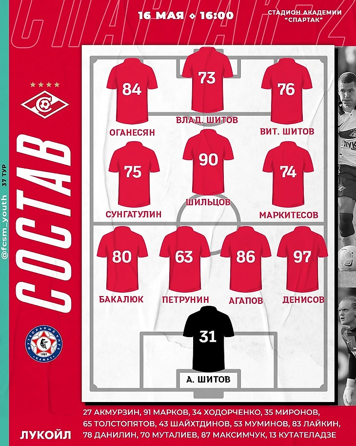 Запасные: Марков, Акмурзин, Миронов, Толстопятов, Шайхтдинов, Данилин, Максимчук.