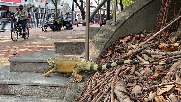 По тротуарам там ходят игуаны желто-зеленого цвета. И одна игуана на моих глазах проехалась на эскалаторе: зашла на уличный эскалатор между двумя переулками, встала на ступеньки и поехала наверх. Видимо, она там живет.