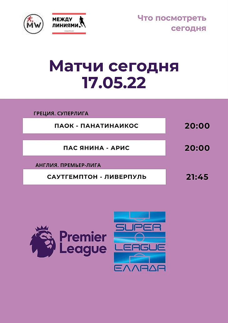 Саутгемптон - Ливерпуль Последний матч 37 тура. Сумеет ли Ливерпуль без двух ключевых футболистов Ван Дейка и Салаха сохранить интригу за чемпионской титул до последнего тура? Саутгемптон при определенных раскладах может покинуть АПЛ. Это случится если Бернли наберет 6 очков в перенесенном матче плюс последнем туре, также если Саутгемптон не сможет набрать ни одного очка в двух последних матчах. При равенстве очков будет учитываться разница мячей. Так что Саутгемптон не лишен турнирной мотивации, и зацепив одно очко в этом матче, обезопасит себя от угрозы вылета. Ничья Ливерпуля формально делает МС чемпионом, так как даже если в последнем туре Сити проиграет и Ливерпуль выиграет равенство очков не позволяет Ливерпулю стать чемпионом при текущих разницах мячей(Сити опережает Ливерпуль на 7 мячей, но у ). В общем "мерсисайдцам" необходима победа, как воздух да и в лучшем случае разгромная. ПАОК - Панатинаикос Четыре команды Суперлиги Греции поделили путевки в еврокубки. Олимпиакос остался недосягаемым, но три команды могут улучшить свое положение. Среди них ПАОК и Панатинаикос. Хозяева могут упустить вторую строчку если сыграют в ничью, а Арис выиграет свой матч против Янины. В таком случае команда может вовсе опуститься со второго на четвертое место. Панатинаикос в случае ничьи и победы Ариса в параллельном матче может рассчитывать на второе место. Хотят ли обе команды завесить от результата в параллельном матче, ведь в случае победы гарантируют второе место. ПАС Янина - Арис Как написано выше победа Ариса позволит подняться на третью строчку в случае ничейного результата в матче ПАОК-Панатинаикос. На первый план в Греции выходят личные встречи. В таком случае у трех команд станет одинаковое количество очков. А Панатинаикос имеет преимущество по личным встречам перед обоими клубами, а Арис преимущество перед ПАОКом. Вот такой интересный расклад в Греции.