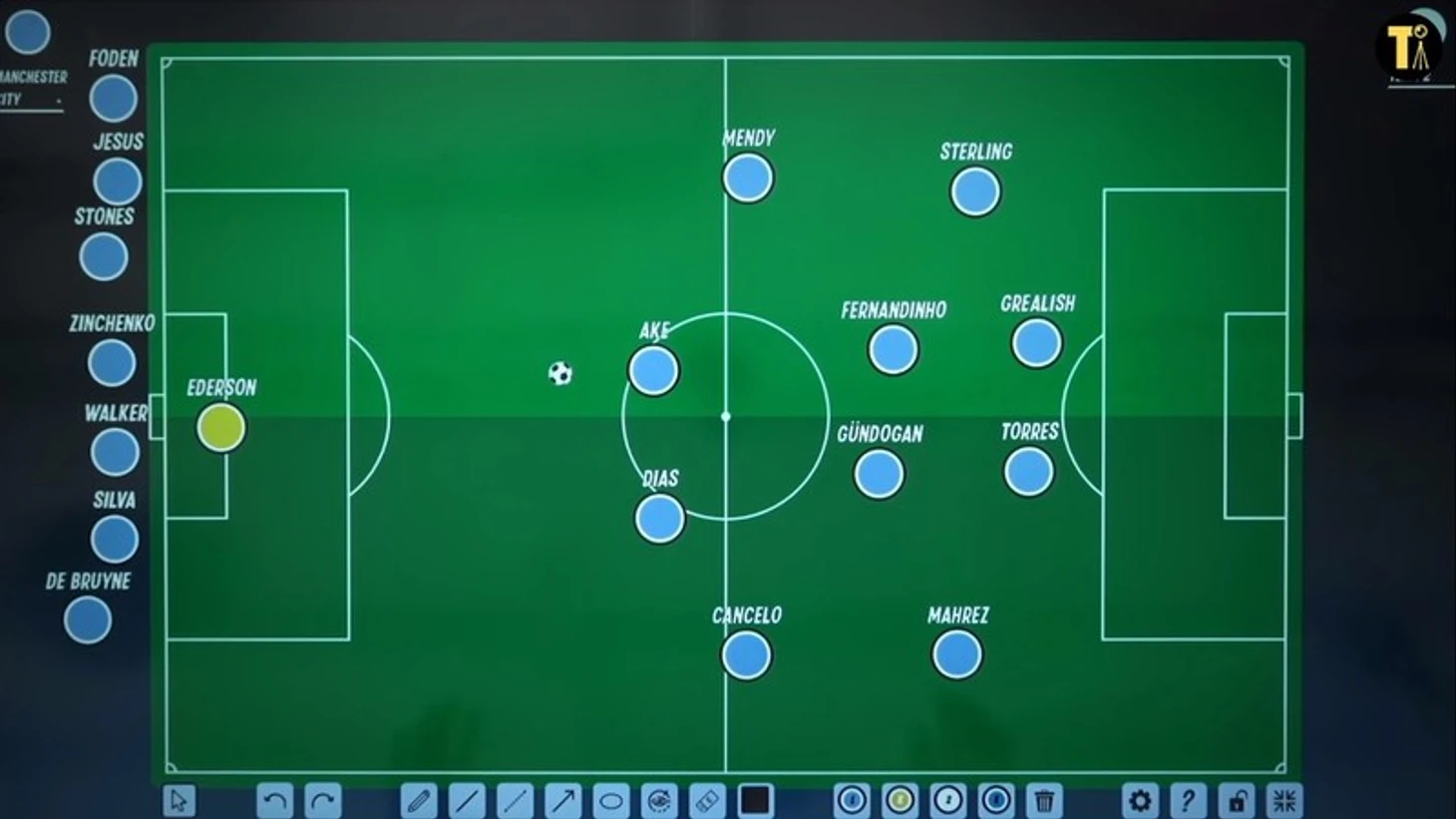 Можно вспомнить "Милан" Ариго Саки, компактный блок, с высокой линией обороны, позволяющей оставаться в той же структуре без владения. Роли, которые играют Кансело и Менди - широкие фулбеки, со смещением в центр, с Фернандиньо, опускающимся в тройку, к защитникам. Итак, мы видим, что защитник идет в центр полузащиты, чтобы защититься от потенциальной контратаки, создать численное преимущество, а затем в линию опускается и Гюндоган.