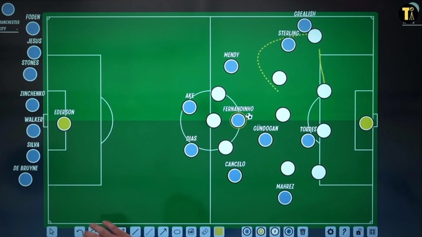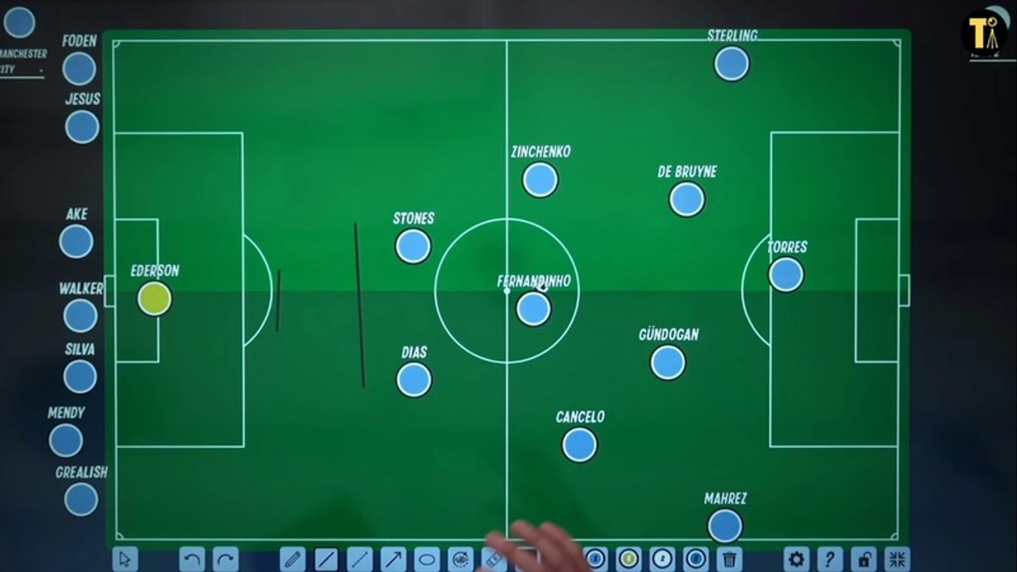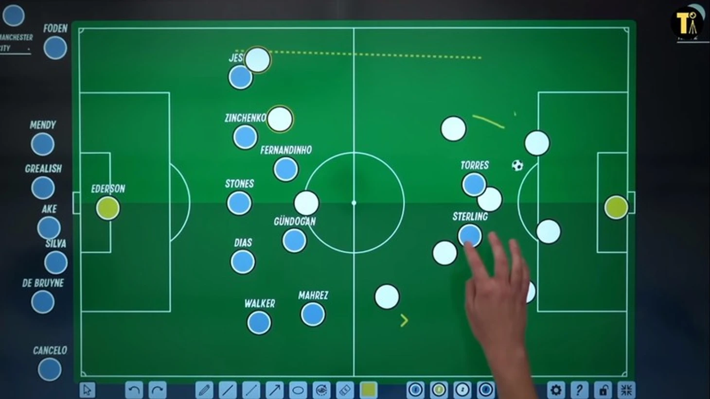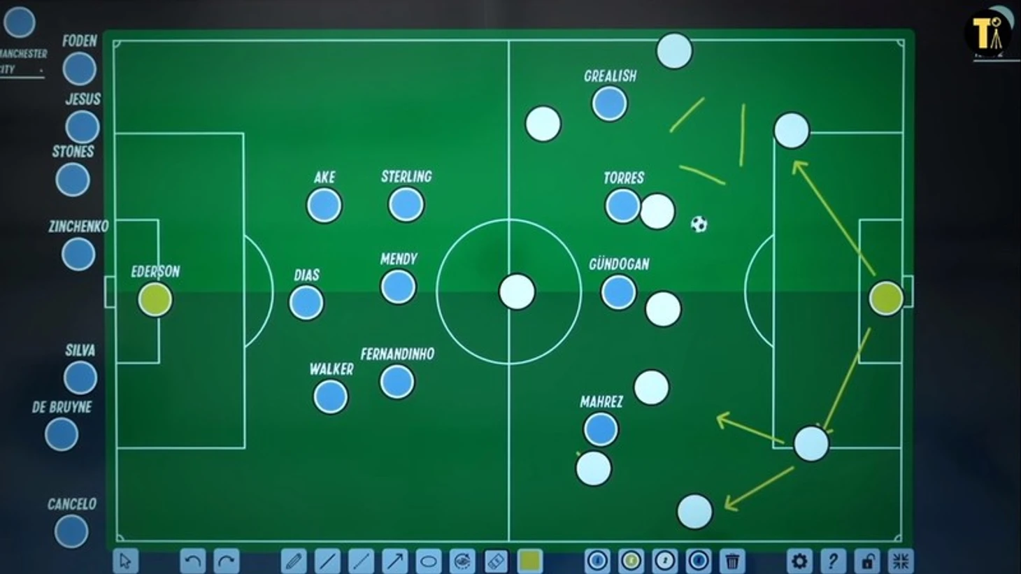 Формально нападающие, Грилиш, Торрес и Стерлинг, опускаются в полузащиту, формируя треугольники, для удобного и активного прессинга владеющего мячом соперника. Для соперников "Сити" это создает необходимость в вынужденных перемещениях, из-за которых образуется пространство, которое заполняют игроки Гвардиолы. Пример из матча против шпор, то, как Танганга - защитник "Тоттенхема", разрывался между Грилишем и Стерлингом отлично это иллюстрирует. Игроки "Сити" по цепочке создают пространства и заполняют их, получая моменты и отличные возможности для взятия ворот. Здесь важно отметить свойственную Гвардиоле манеру, привнесенную в 4-4-2, которая формально такова, но на деле, в процессе трансформируется в команду с пятью и более нападающими, каждым в равной степени способным поразить ворота или сделать голевую передачу. Так, в "Сити" фактически получается, если посмотреть сверху вниз, атакующая форма в виде 5-2-3. Конкретная формация зависит от того, против кого играет команда Гвардиолы, так у "Манчестер Сити" были матчи когда они играли 4-4-2, по ходу матча преобразующуюся в 4-2-3-1, и наоборот.