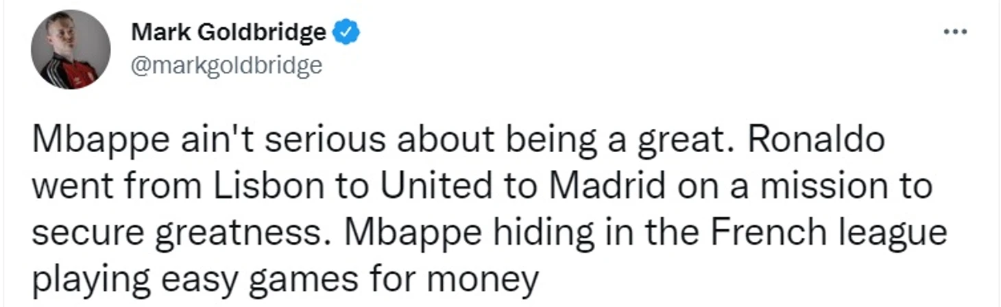 «Мбаппе недостаточно серьезен для того, чтобы быть великим. Роналду отправился из «Спортинга» в «Юнайтед», а затем в «Реал» с четкой миссией – добиться величия. Мбаппе прячется во французской лиге, зарабатывая деньги в легких матчах».