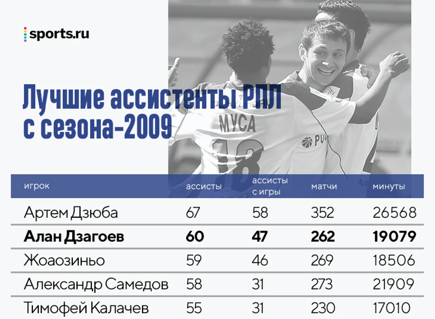 Дзагоев дебютировал за ЦСКА в 17 лет, а разорвал РПЛ через несколько месяцев, когда Алану уже исполнилось 18. В первый же сезон Дзагоев оформил 8+9 по системе «гол+пас» – совершенно феноменальный результат.