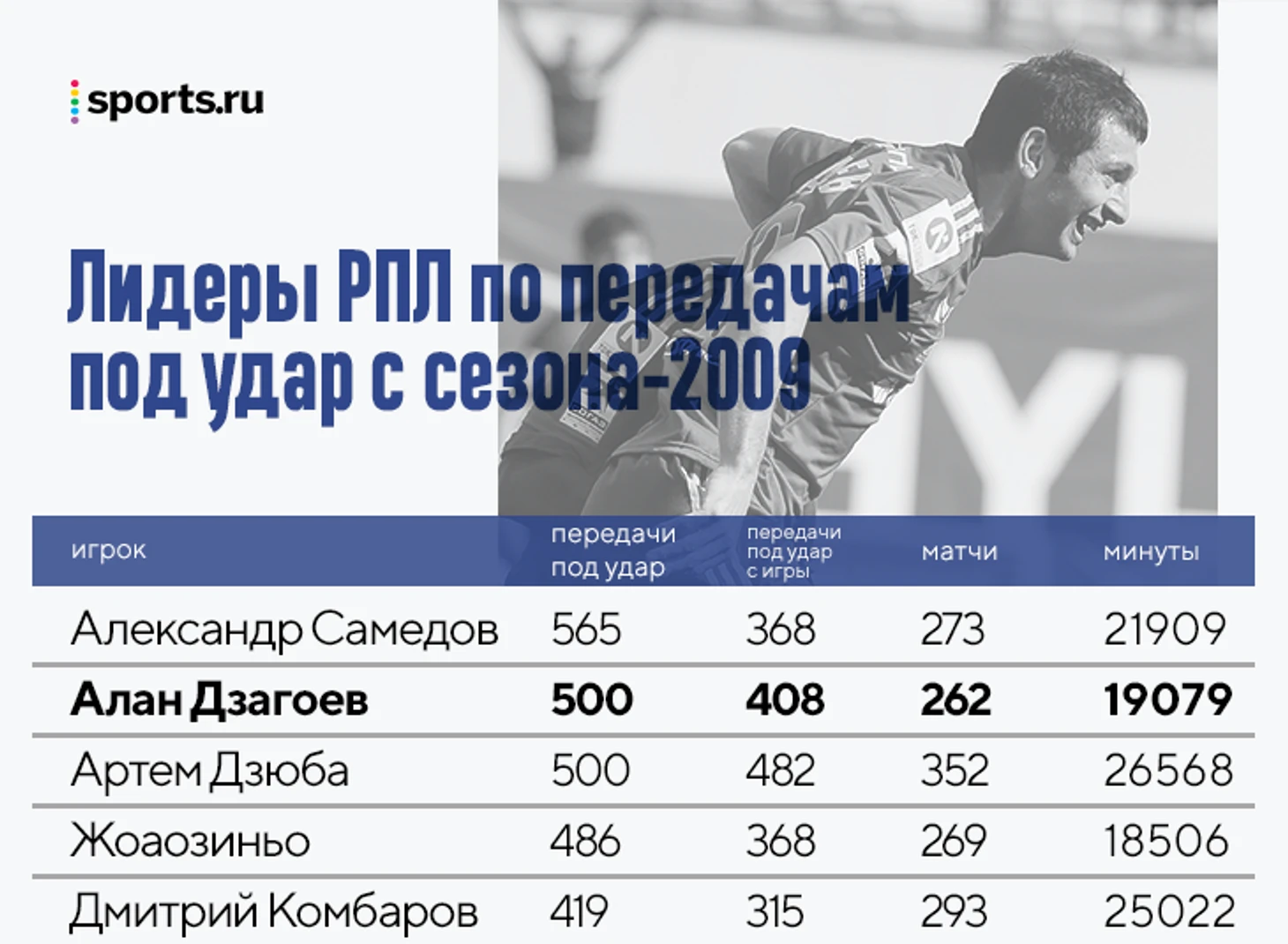 По количеству передач под удар Дзагоев – тоже в топ-3 РПЛ с сезона-2009.