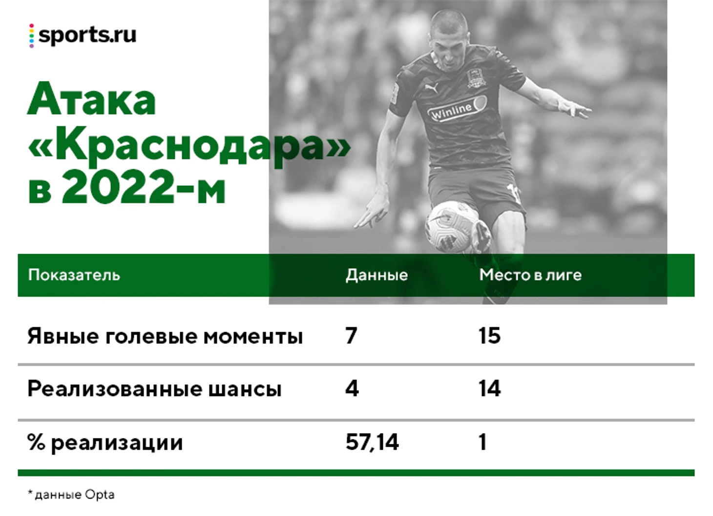 Главная черта старта «Краснодара» – умение взрываться и контратаковать. В первых матчах у команды Сторожука не получались конструктивные позиционные атаки, но краснодарцы идеально воспользовались минимальными шансами («Спартак» создал больше, а «Уфа» перекрыла выход из обороны в атаку): заработали пенальти в контратаке после обреза Айртона (2:1), реализовали быстрый отрыв после перехвата в Уфе (1:1), наказали «Рубин» в контратаке (1:0).
